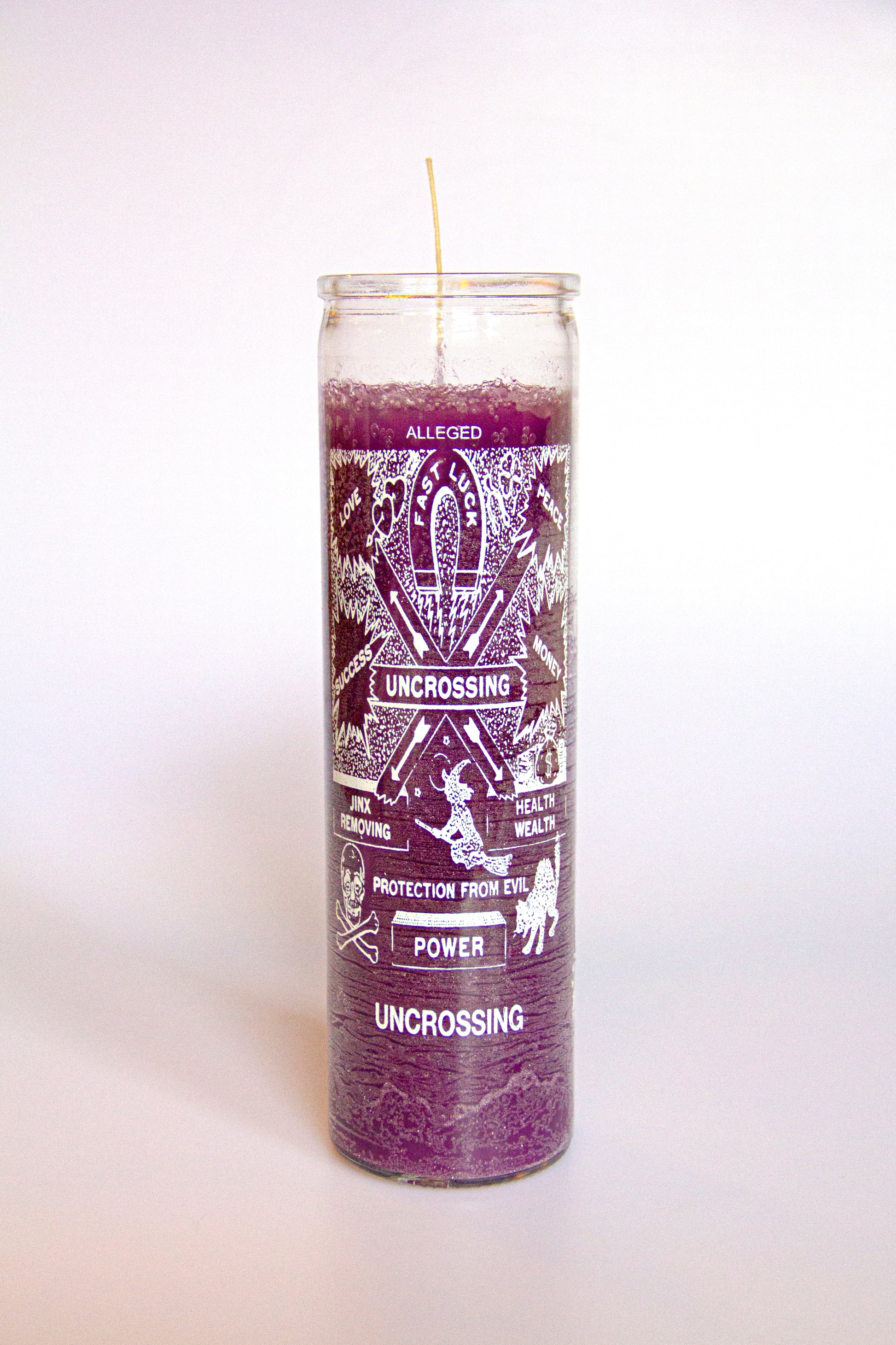Uncrossing candle is typically used when one believes they are under spiritual or energetic blockages, negative influences, or a run of bad luck. Burning this purple candle symbolizes spiritual power, healing, and purification. The uncrossing candle ritualistically, invokes the removal of obstacles, curses, hexes, or any form of negative energy that may be affecting their life. Burn to restore spiritual balance, clear away harmful energies, and create a path of positive transformation.